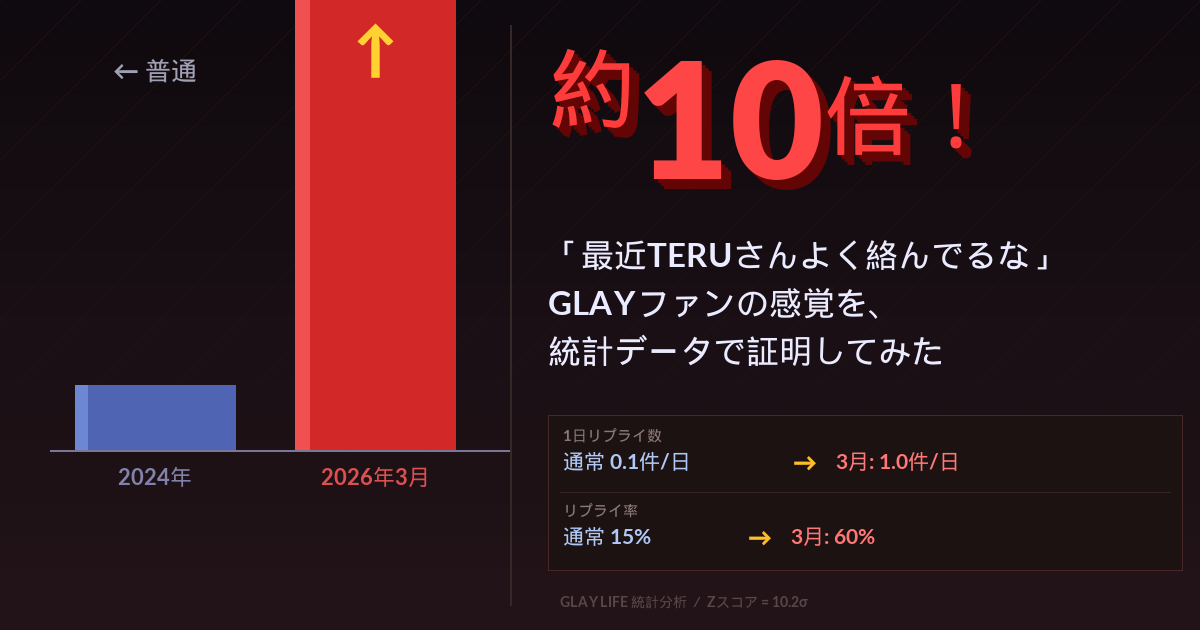 というわけで今回は、TERUさんのXアカウント(@TE_RUR_ET)の投稿データを収集・分析し、2026年3月のリプライ爆発が過去の傾向と比べてどれほど異常(もちろん最高の意味で!)なのかを、統計学的に検証してみました。「統計とか数字とか苦手…」という方にも分かりやすく解説しますので、ぜひ最後までお付き合いください!
