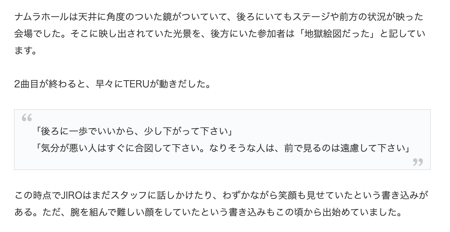 「ROCK’N’ROLL SWINDLE」「変な夢」のあとにも、TERUが再び呼びかけました。一応いくらか落ち着いたという証言がある一方で、その後もMC中に押し合いが続いていたという証言もあり、このあたりは情報が錯綜している。まあ見る人・場所によって、そして感じ方も人によっては違うので仕方ない。